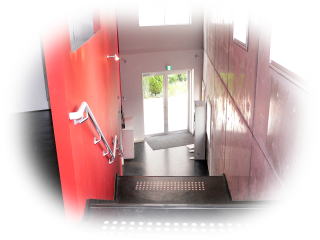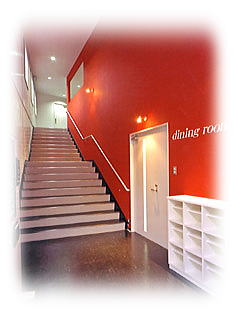 玄関を入ってすぐのロビーです。『赤』の壁が印象的です。もっとも大好きな空間です。卒業アルバムのクラス写真なんかにいいんじゃないかなぁ?