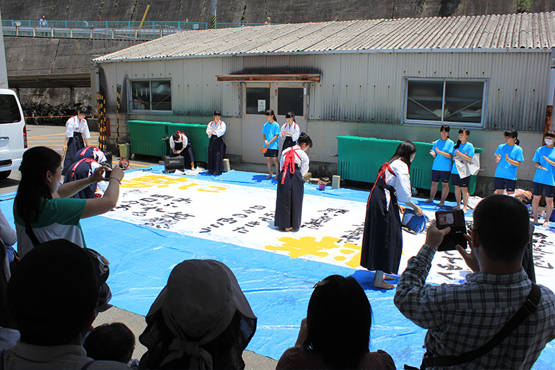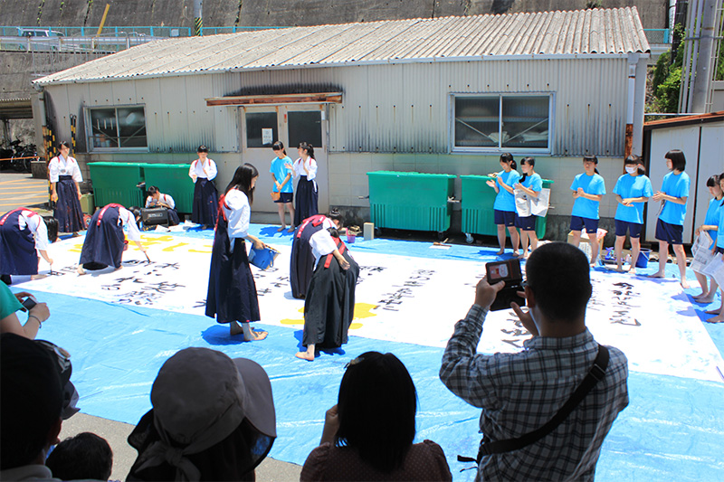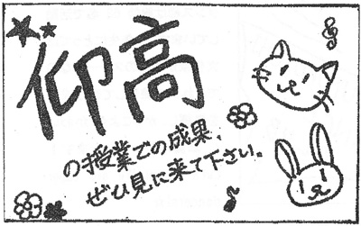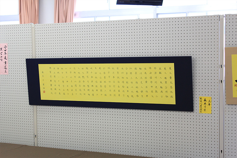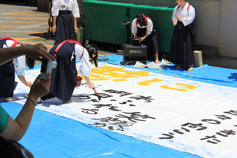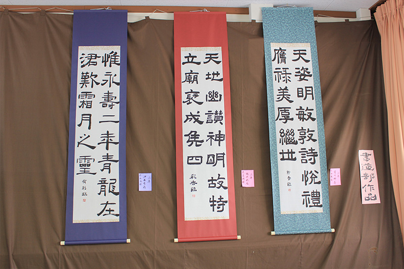 書道部は明るくてパワフルな部活です。日々練習に取り組んできた私達の作品を書道教室に展示してあるので見に来て下さい。また土曜日には美化倉庫前で大書をするので応援お願いします。