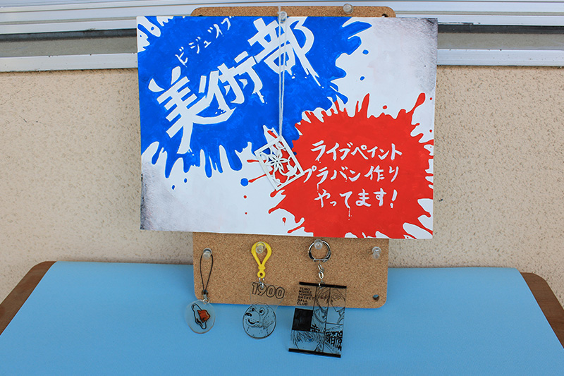 美術都はB棟3Fの美術室で活勣しています。今年もライブペイント&プラ板作り体験をやるのでぜひ覗いてみてください!部員一同、心よりみなさんのお越しをお待ちしています。作品も展示中!