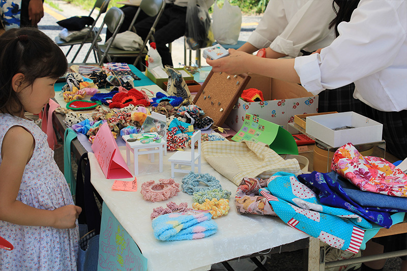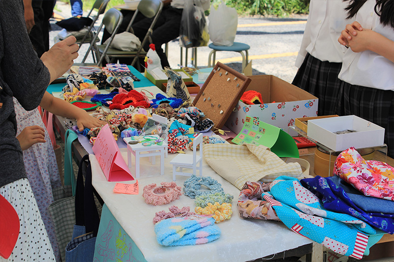文化祭に向けてかわいい雑貨品をたくさん作りました。ストラップやシュシユ、卜一トバックやレジンなど様々な商品を作りました。外のテントで販売しているのでぜひ見に来て下さい!!