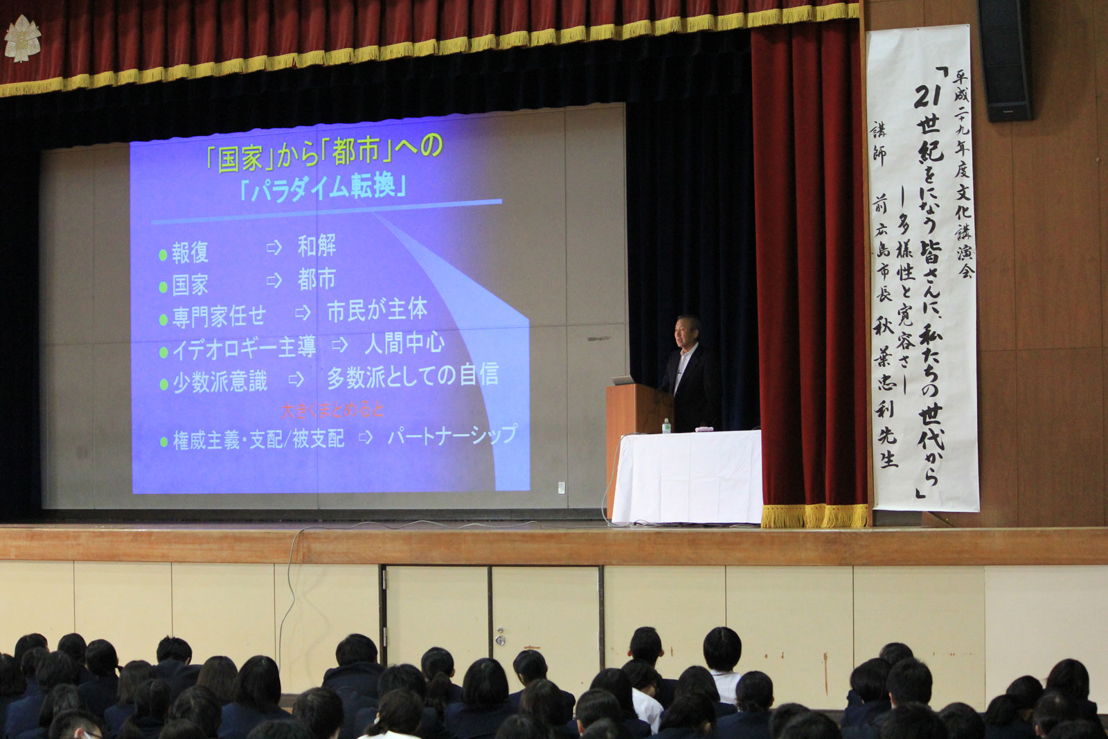 11月2日、安古市高等学校同窓会主催で、毎年11月の「学校へ行こう月間」の行事として、さまざまな分野で超一流の先生に来ていただいている文化講演会を開催しました。