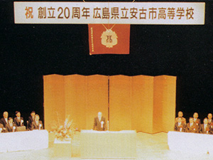1995年11月18日に20周年事業として、記念式典・記念行事を広島厚生年金会館にて開催しました。県議会議員、市議会議員、教育委員会関係者、歴代校長、中学校校長ならびに安古市高校関係者を含め約1500名の大式典でした。