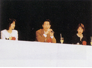 記念式典に引き続き、記念行事が行われました。二部構成で第一部が吹奏楽部による演奏でした。第2部は、卒業生を特別ゲストとして招きました。2期生で外科医の橋本さん、2期生でフルート奏者の宮中さん、15期生でテレビで活躍中の戸田菜穂さんの3名です。